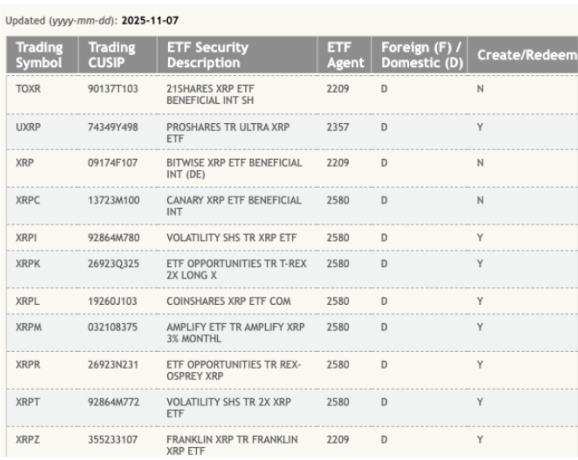 Bu hafta itibarıyla DTCC web sitesi, 21Shares, ProShares, Bitwise, Canary Capital, CoinShares ve Franklin Templeton gibi büyük ihraççıların yer aldığı aktif ve lansman öncesi kategorilerde toplam 11 XRP ETF ürününü listeliyor.